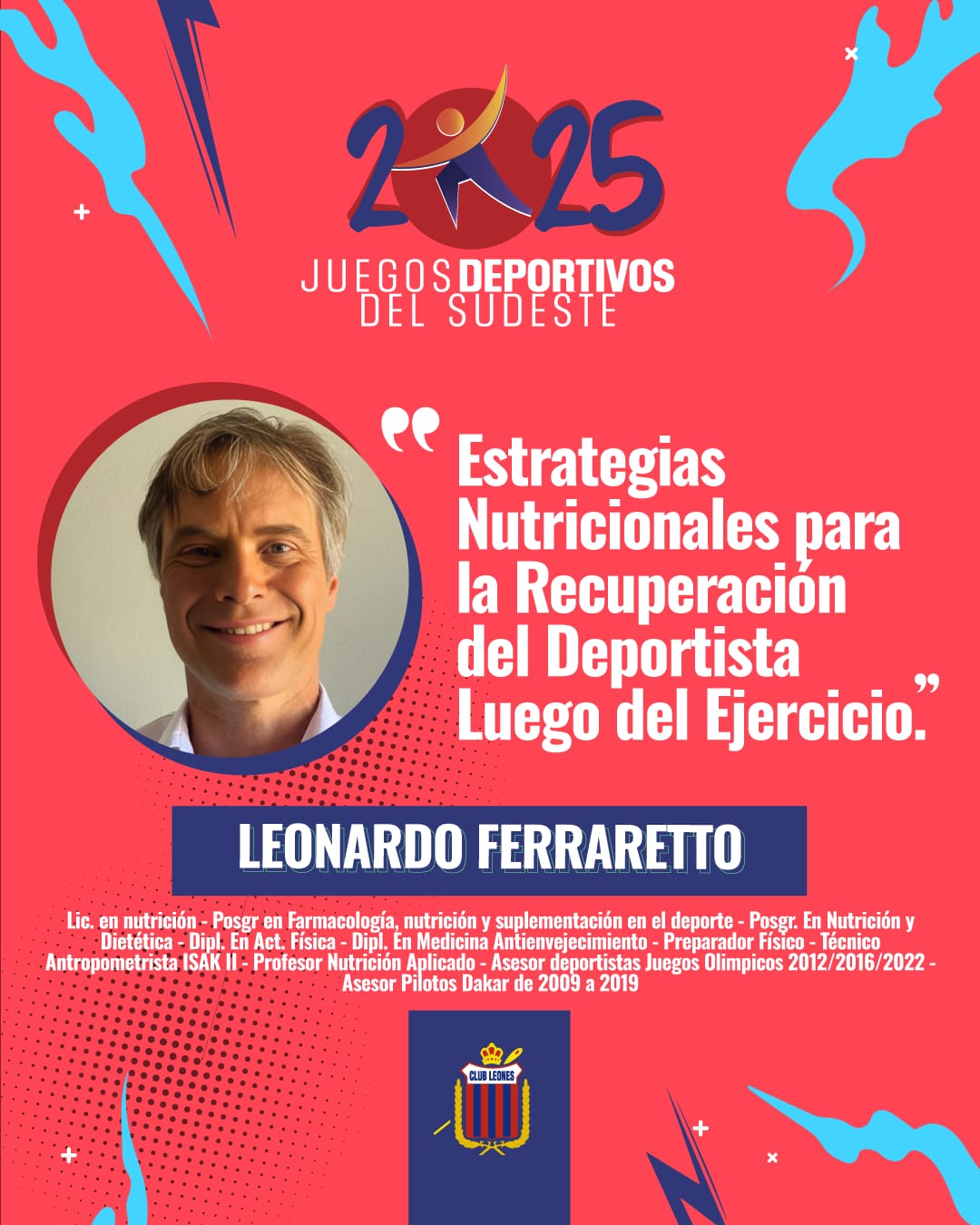 “Estrategias nutricionales para la recuperación del deportista luego del ejercicio” a través del licenciado Leonardo Ferraretto, especialista en nutrición, farmacología y preparación física, con experiencia en Juegos Olímpicos y el Rally Dakar. Actividad gratuita con certificación de la Universidad Nacional de Córdoba. Una oportunidad única para deportistas, entrenadores y profesionales del área.